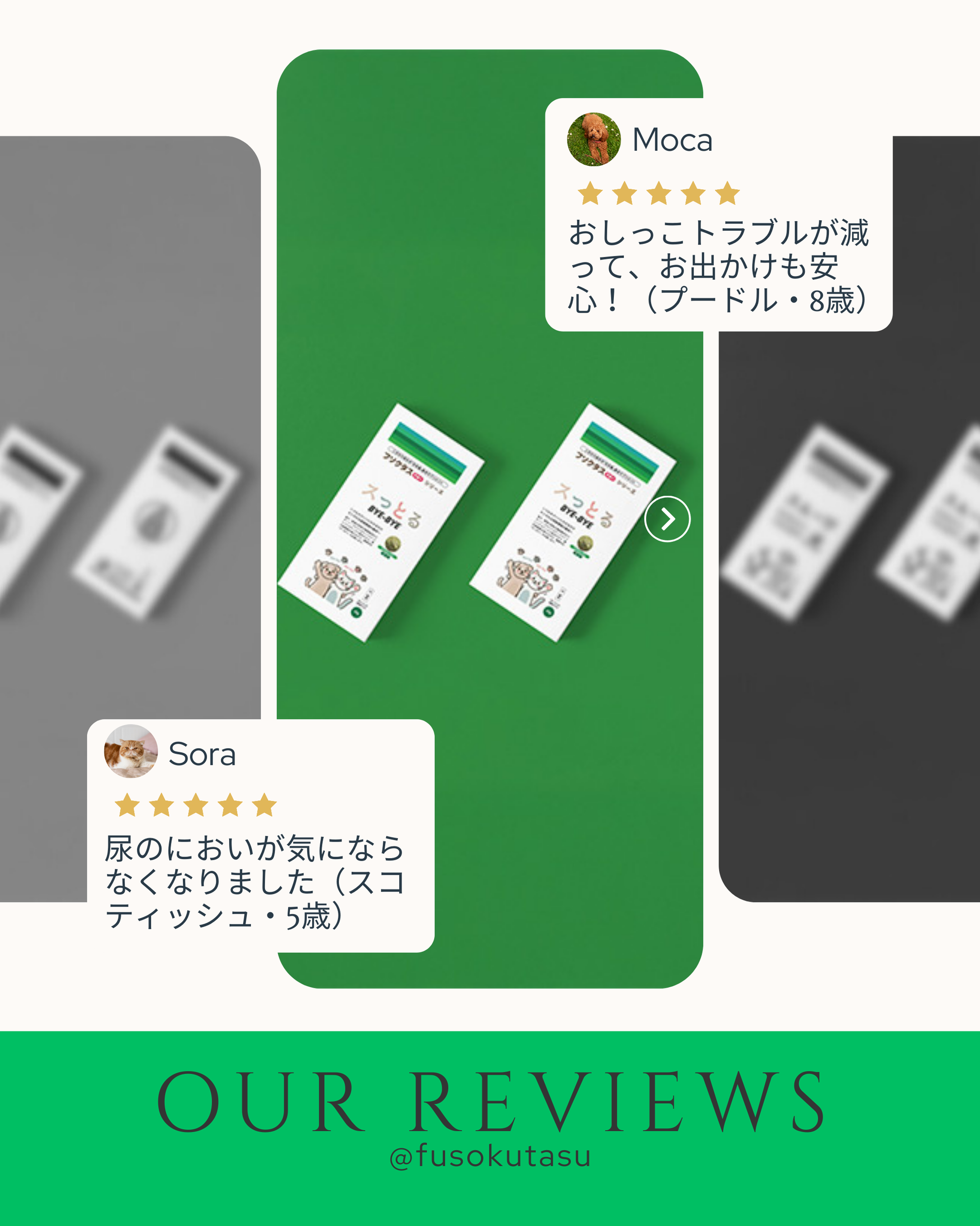 「おしっこの悩みが減って、お出かけも安心になりました。フードに混ぜても嫌がらず食べてくれて助かっています。」